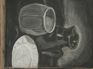 I think this charcoal piece is really cool. It was fun to watch it being "born". It is his homework assignment due tomorrow. After one class in charcoal he said he really didn't like it and must have gotten into a lot of trouble with his mother when he was a kid and was having flashbacks about getting dirty. Working with charcoal is a real mess and he didn't enjoy it much. He had to cover the page with charcoal (accomplished outside with extra charcoal washed into the grass) and then work the charcoal off with a special eraser (it gets kneaded and wadded up like clay). The wash room was covered with drop cloth to catch any stray charcoal and Dick did his Johnny Cash impression dressing all in black. Tomorrow the class is working with ink and Johnny Cash will be attending class again.