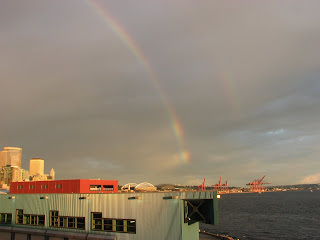 We were just back from Bainbridge Island, relaxing in our hotel room on Saturday afternoon watching the Mariners baseball game, when the announcer mentioned a rainbow over the field. We dashed out to the balcony and found a double rainbow. It was beautiful. I can't tell you how long it had been since we'd seen a rainbow, let alone a double one (squint to the right). One of nature's many miracles.