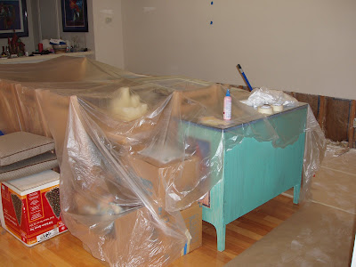 All the furniture moved to the center of the room (there were three more rooms just like this). The guys doing the work tried to be neat, but when you are working with drywall and plaster ... neat isn't in the vocabulary. The downstairs is pretty much back to normal. We are still working upstairs. Our guest bedroom is a real mess. Everything that had to be moved somewhere to get it out of the way of the destruction/construction was placed in that room. A lot of it is still there. Guess I should start cleaning clutter! I groan whenever I think about going in the room.