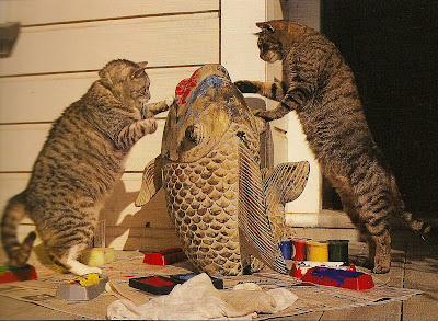 From the back of the postcard: "Whether these cats are engaged in territorial marking behavior, as many biologists would contend, or actually decorating the fish for aesthetic reasons, remains open to debate. However, the fact that the cats showed no aggression towards each other during the two-hour painting session, strongly suggests it was a genuine aesthetic experience."