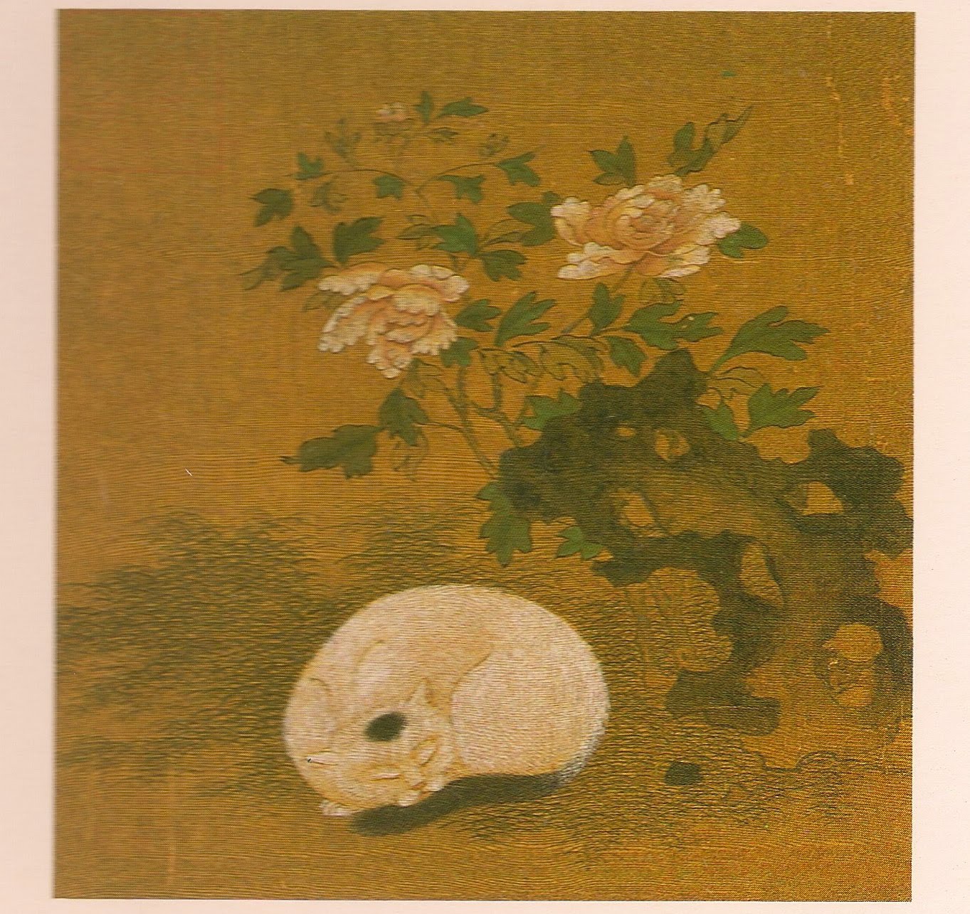 The back of the postcard reads: "Cat, Rock, and Peonies, 18th century. (Chinese),