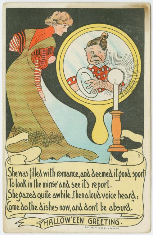 This must be a take-off on the mirror-mirror story. What she sees in the mirror is enough to scare any beaux away!